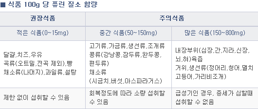 2010년 일본의 고요산혈증 및 통풍의 치료 가이드라인에 따르면 맥주 효모의 퓨린 함량 은 2995.7㎎/100g 인데 비해 소간은 219.8㎎, 미역 262.4㎎, 말린 멸치 746.1㎎, 다시마 684.8㎎ 등으로 상대적으로 적었다